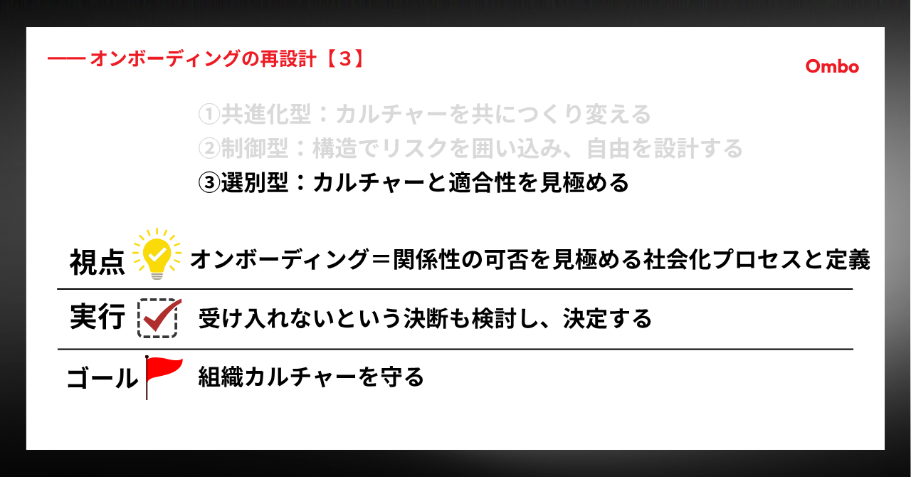 オンボーディングとは、文化に染めるプロセスではなく、文化を更新するプロセスであると考えます。その前提に立つと、アプローチは大きく3つに整理できます。