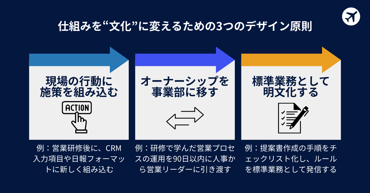 例:営業研修を単発で終わらせず、商談後のCRM入力項目に研修内容を反映する。日報フォーマットに新しい行動チェックを組み込む。