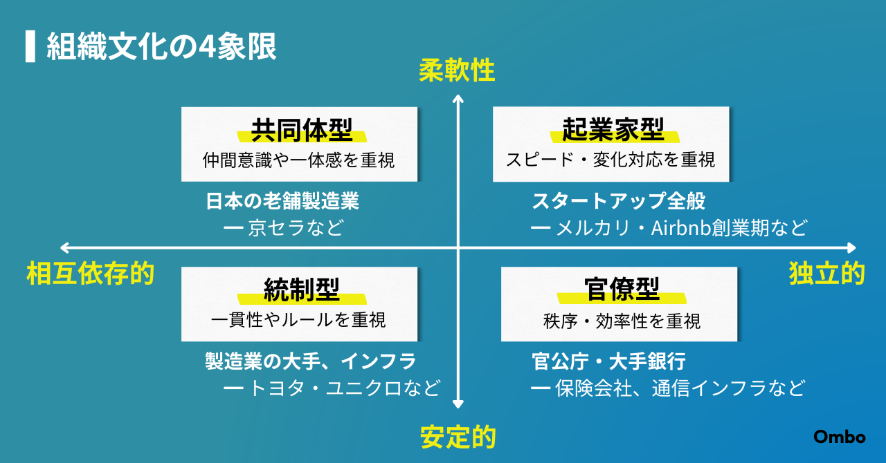 例)日本の老舗製造業(例:京セラ)…アメーバ経営など、仲間意識と共通目的を重んじる。 - 柔軟性×独立性:起業家型(スピード・変化対応を重視)